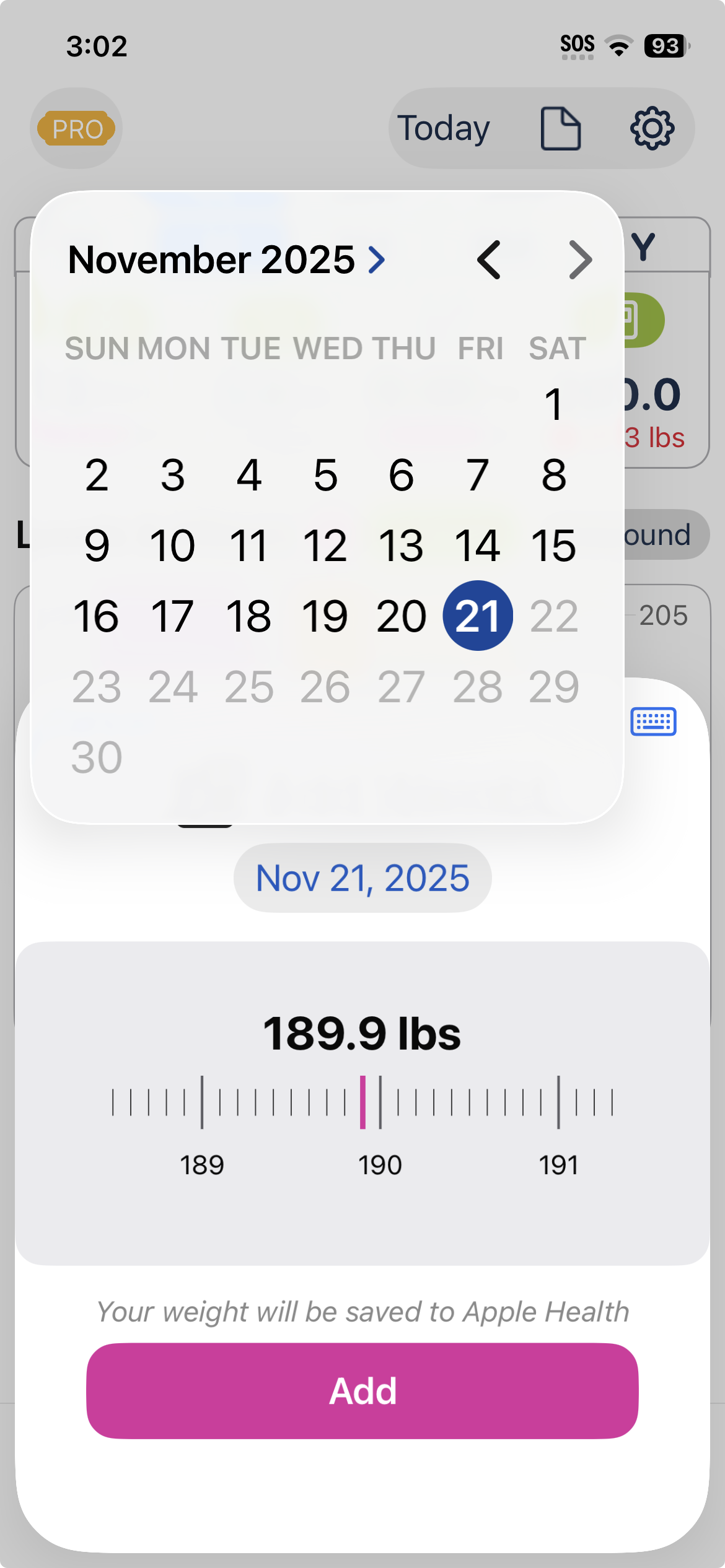 Select your weight — it will be saved for the date you chose in Calendar view (not just today).