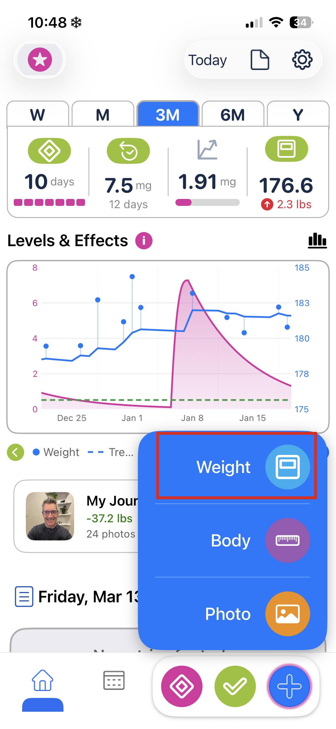 - Tap the + button in the bottom nav bar and select Weight.