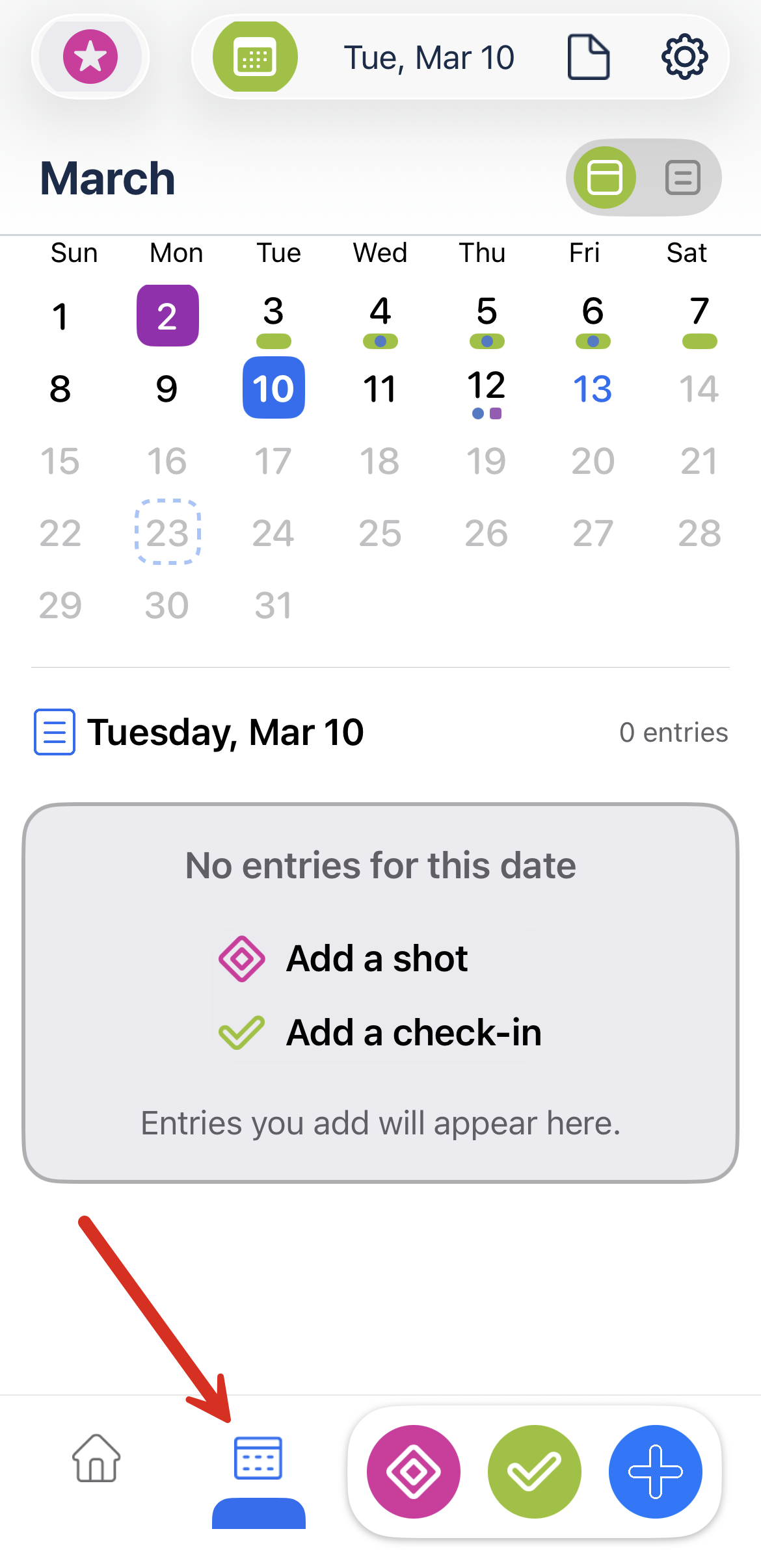 - Tap the Calendar icon (bottom right) to open the Calendar view.