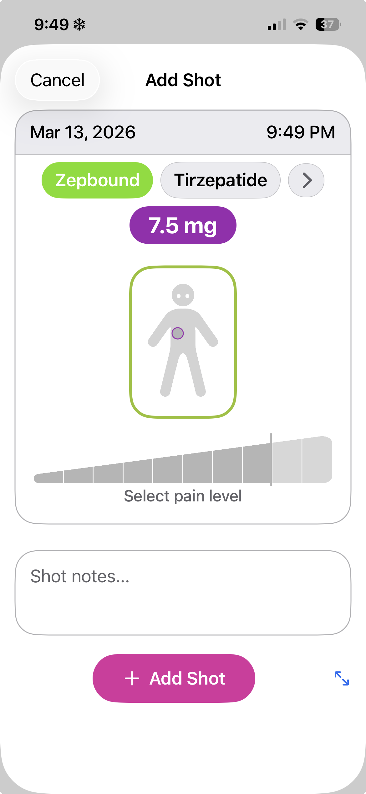 If you take multiple medications, all of your favorites appear together, making it easy to switch between them and log each shot separately without digging through menus.