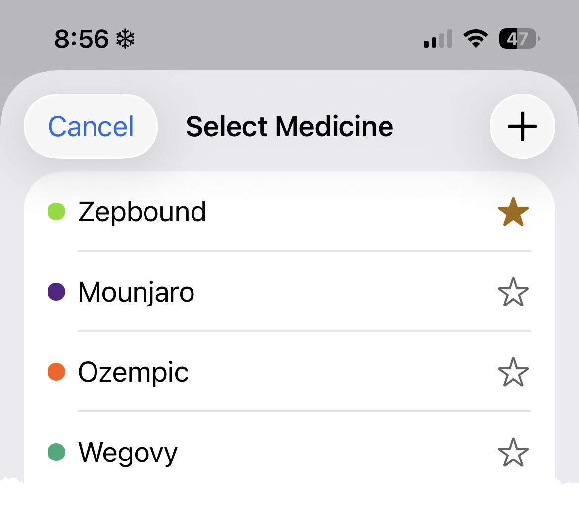 Pokii includes all major GLP-1 medications out of the box, but if yours isn't on the list — a compounded version, a trial medication, or anything else — you can add it yourself.
