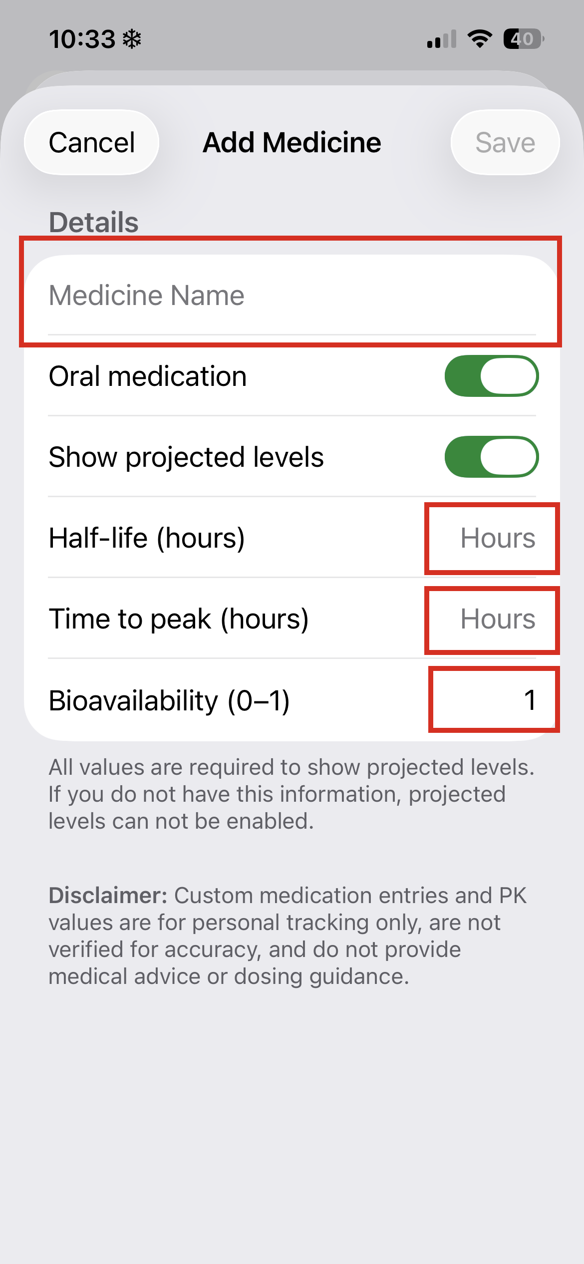 - Show projected levels — turn this on to see an estimated medication level curve on your chart. Requires the three PK values below.